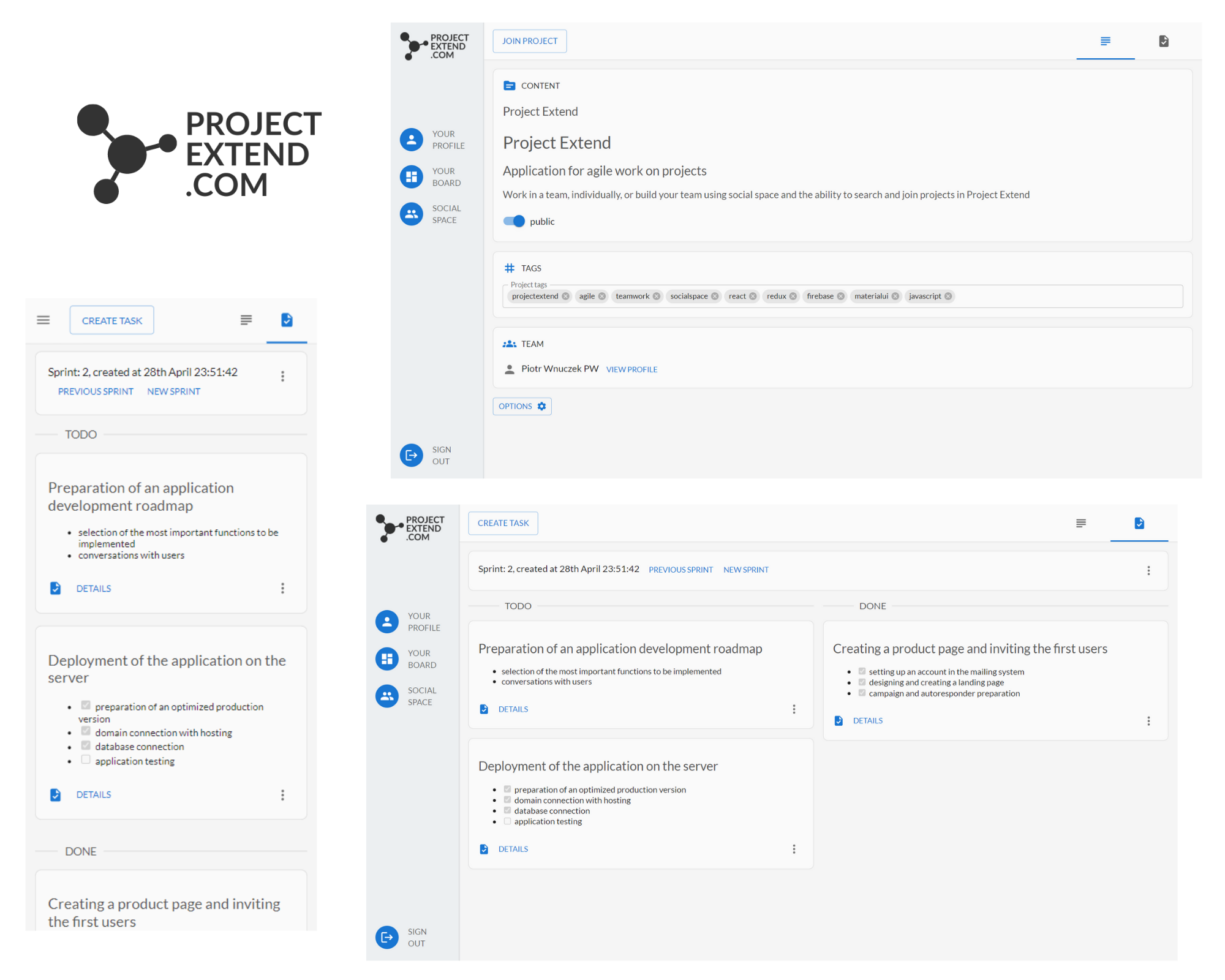 Application for managing individual and team projects. The frontent programmed in React connects to the Firebase backend. User Interface is based on MaterialUI.